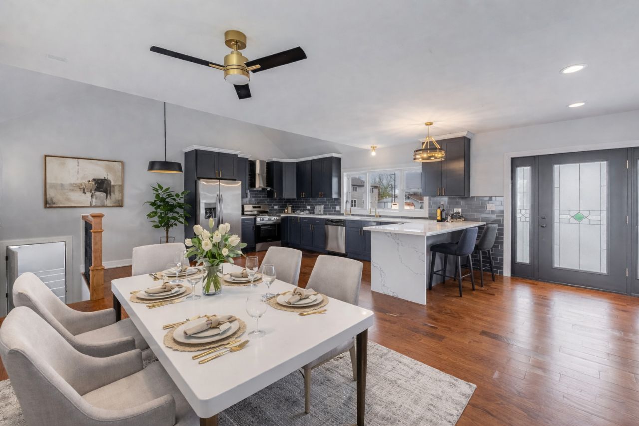 Absolutely stunning brand-new raised ranch featuring modern design and high-end finishes throughout. This thoughtfully designed 3-bedroom, 2 full-bath home offers an oversized 3-car attached garage and impressive curb appeal with contemporary exterior finishes. Step into a sun-filled open-concept main level with oak hardwood floors, oversized windows, and seamless flow for everyday living and entertaining. The show-stopping kitchen features blue shaker cabinetry, quartz countertops, stainless steel appliances, designer backsplash, and custom wainscoting in the dining area. The main level includes a spacious bedroom and full bath with a custom tile shower. The finished lower level offers luxury vinyl flooring, a large family room with an electric fireplace, built-in dry bar, two additional bedrooms, and a spa-inspired bath with rainfall and jet shower system. Enjoy a generous backyard and a rare opportunity to own brand-new construction-move-in ready with no wait. Schedule your showing today!